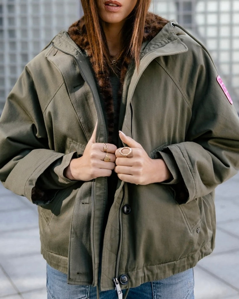 Veste parka kaki à capuche avec doublure fausse fourrure léopard.