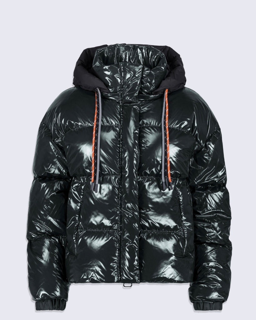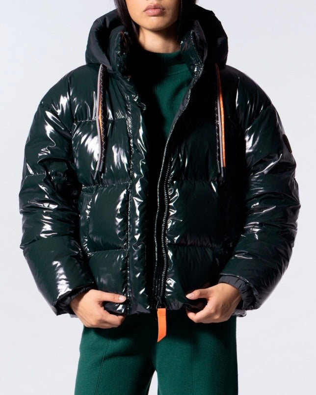 Doudoune courte vert forêt en nylon brillant avec capuche amovible.